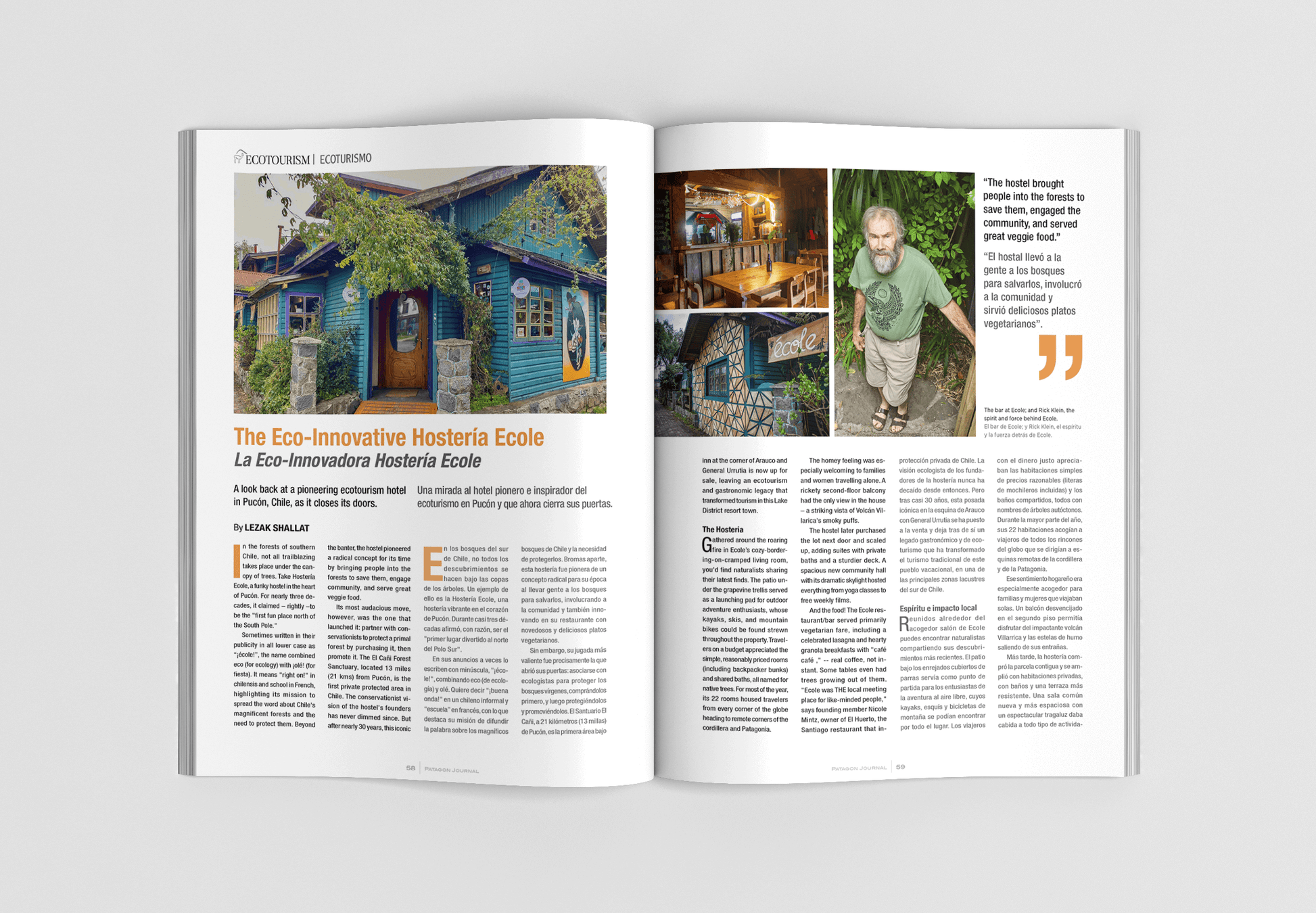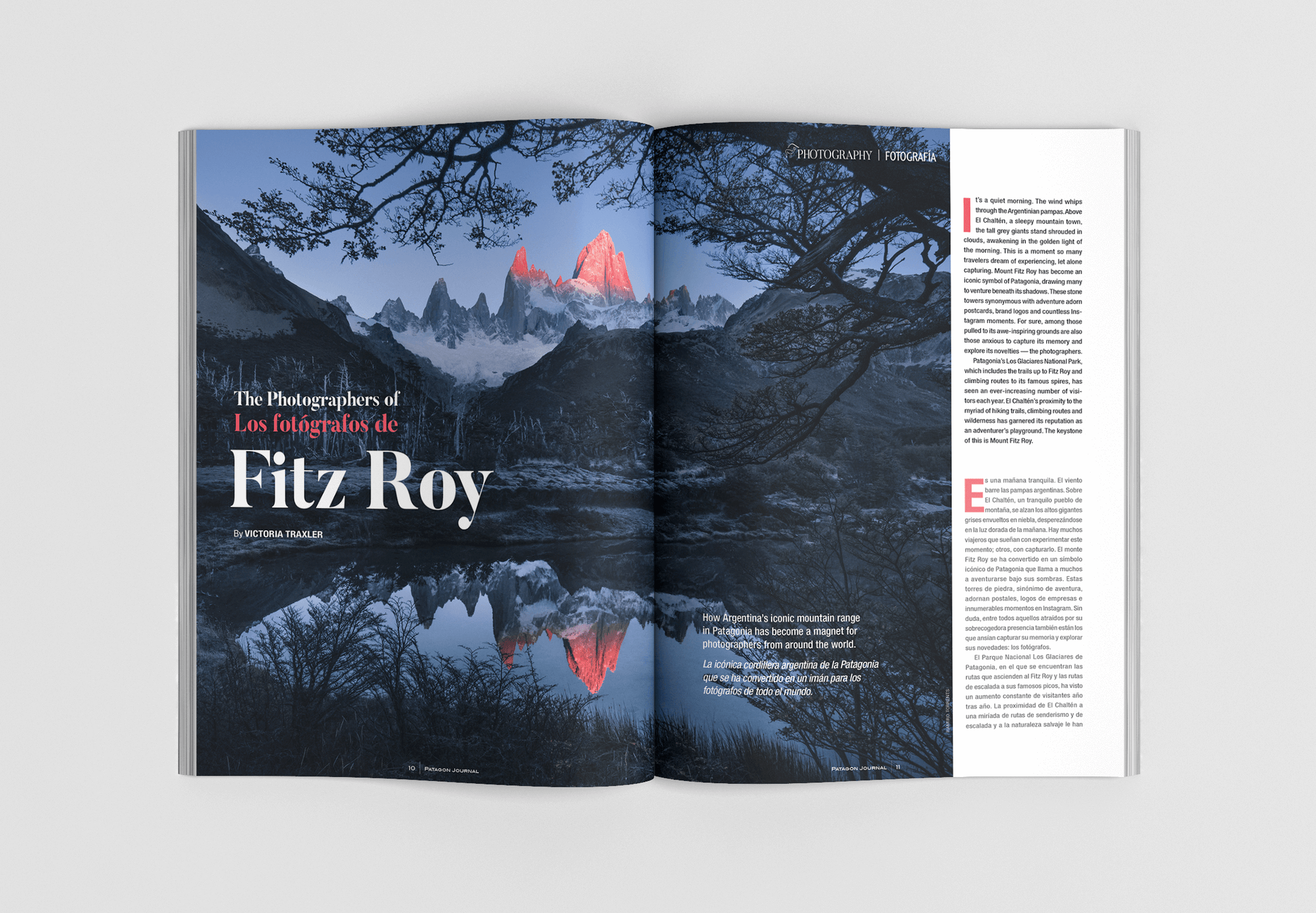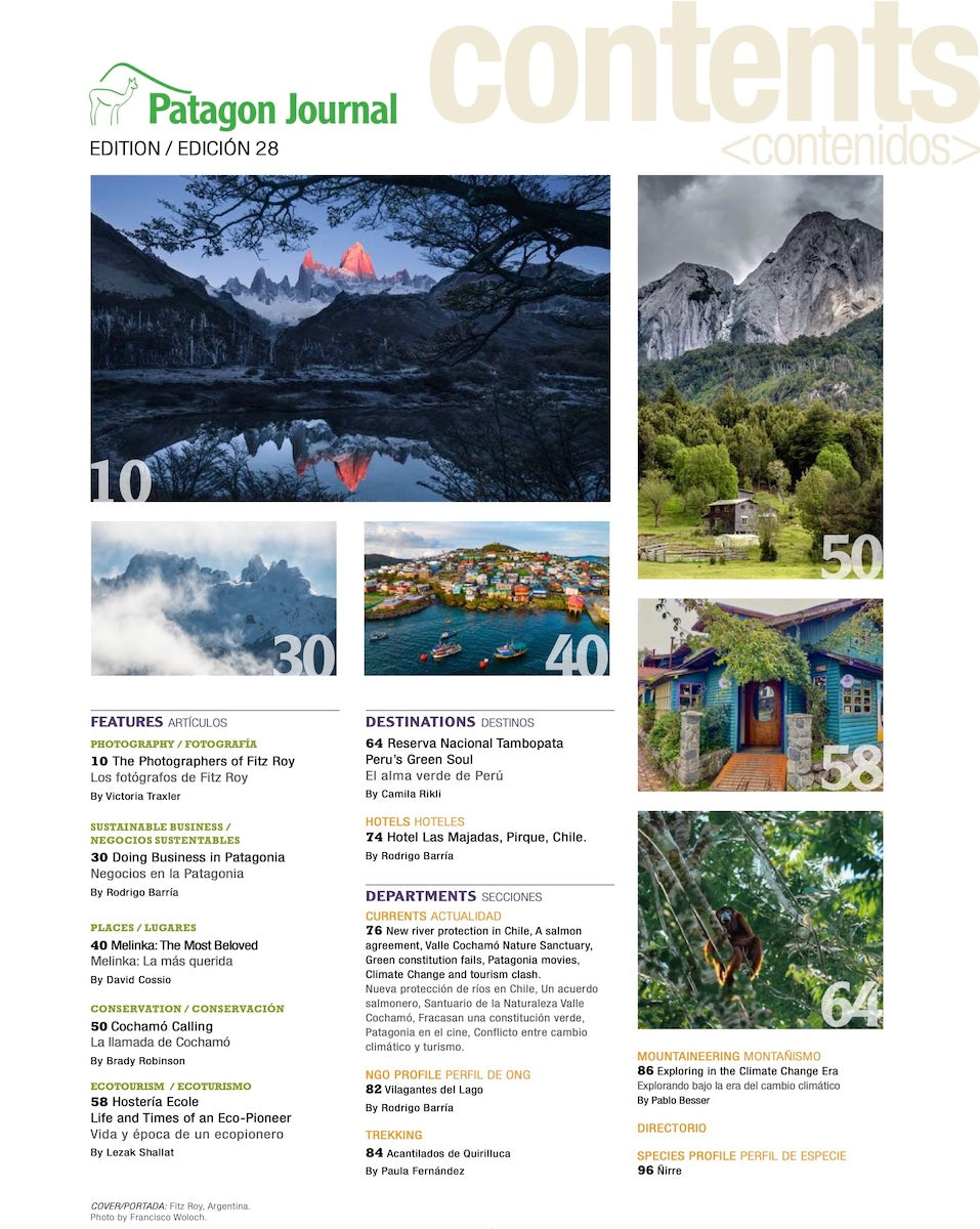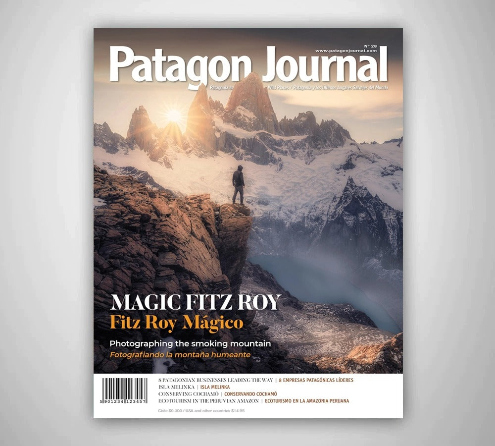 En nuestro artículo de portada, presentamos a tres fotógrafos -Ramiro Torrents, Francisco Woloch y Tad McCrea- dedicados a captar la belleza y la esencia de la cordillera del Fitz Roy. Es un reportaje de 20 páginas lleno de imágenes asombrosas e inspiradoras. También en la edición 28, Rodrigo Barria escribe sobre 8 empresas líderes y sostenibles en la Patagonia; David Cossio nos lleva de viaje a la fascinante isla Melinka; Brady Robinson nos muestra por qué hay que proteger el Valle Cochamó; Lezak Shallat nos cuenta sobre la innovadora Hostería Ecole; Camila Pérez escribe sobre la Reserva Nacional Tambopata de Perú; y mucho más.