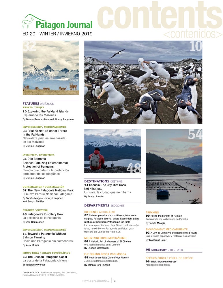 En nuestro artículo de portada, Wayne Bernhardson y Jimmy Langman escriben sobre viajes en las islas Malvinas. Un paraíso para los naturalistas, hay más de un millón de pingüinos en todo el archipiélago. Sin embargo, también existen serias amenazas ambientales para esa vida silvestre, como cuenta Jimmy Langman en una historia complementaria. También en esta edición, un reportaje sobre el nuevo Parque Nacional Patagonia; una entrevista con Dee Boersma, llamada la “Jane Goodall de los pingüinos” por The New York Times; Zoe Baillargeon nos informa sobre los licores de la Patagonia; Alex Muñoz escribe en torno a una Patagonia sin salmonicultura; tenemos un artículo de viajes sobre Ushuaia; y mucho mas.