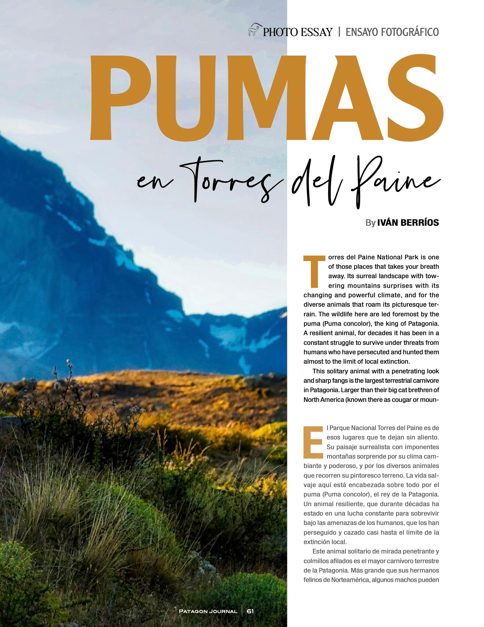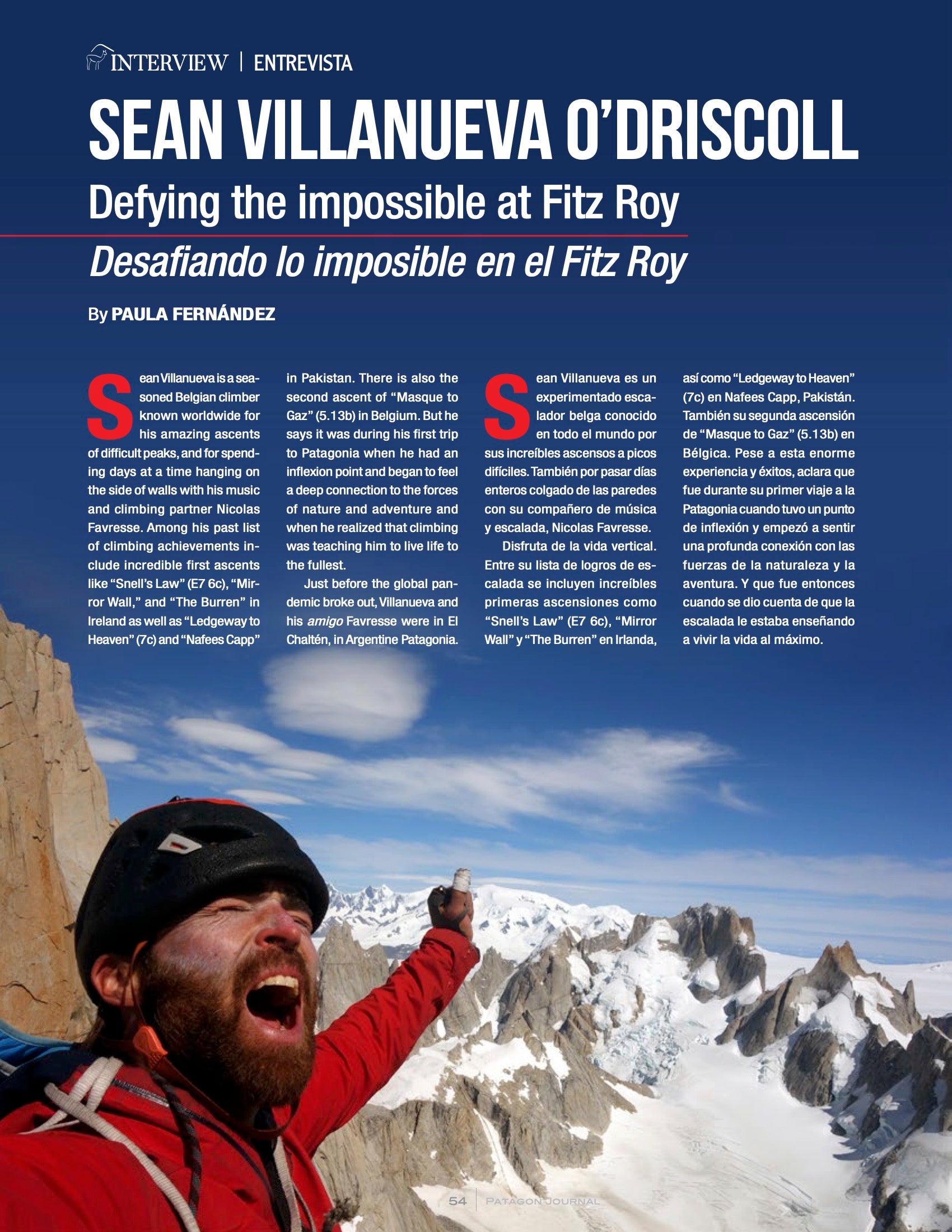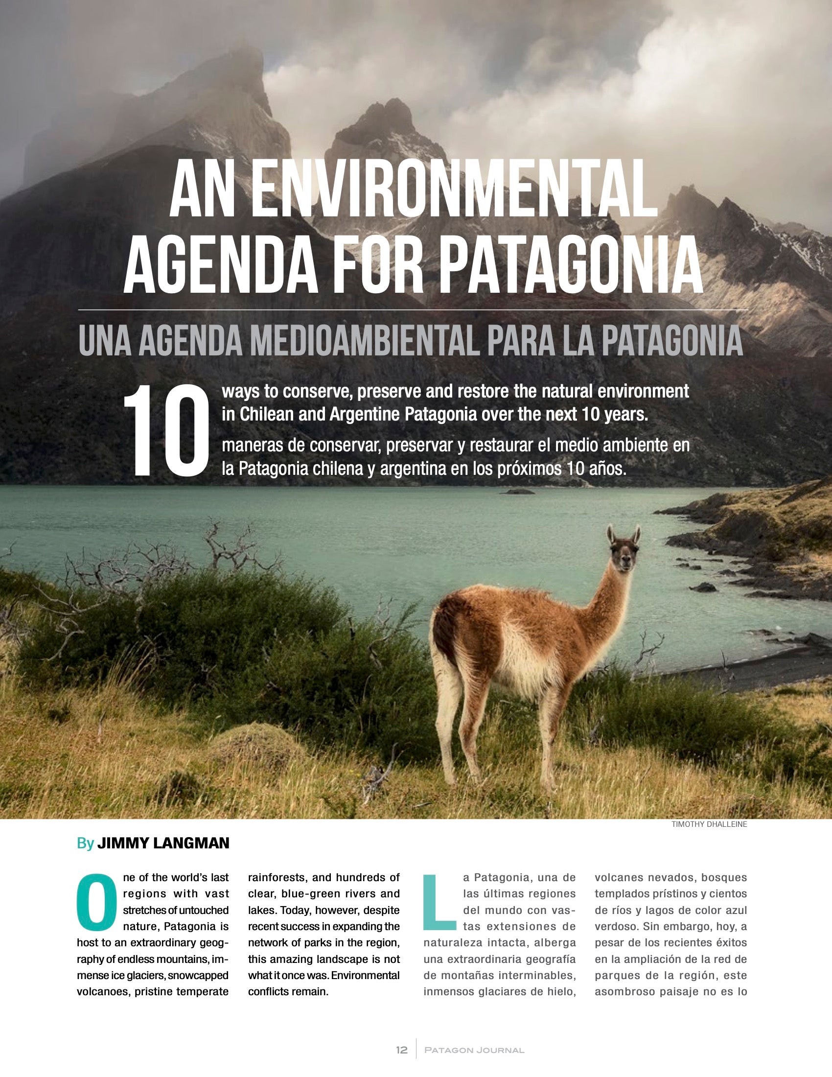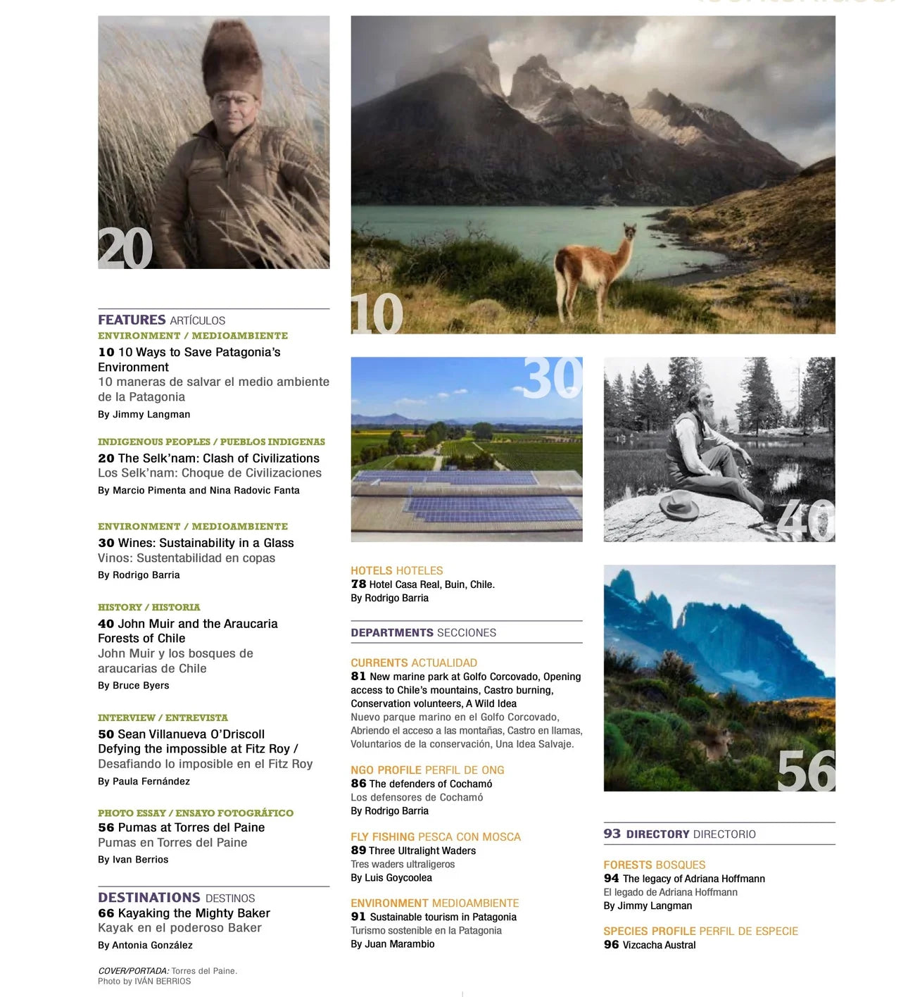 En esta edición,, presentamos 10 maneras de salvar el medio ambiente de la Patagonia en los próximos 10 años. Otras historias de esta edición incluyen artículos sobre la gente indígena Selk'nam de Tierra del Fuego, vinos sostenibles, la visita de John Muir a Chile, una entrevista con el escalador Sean Villanueva, kayak en el río Baker y un ensayo fotográfico de pumas en Torres del Paine.