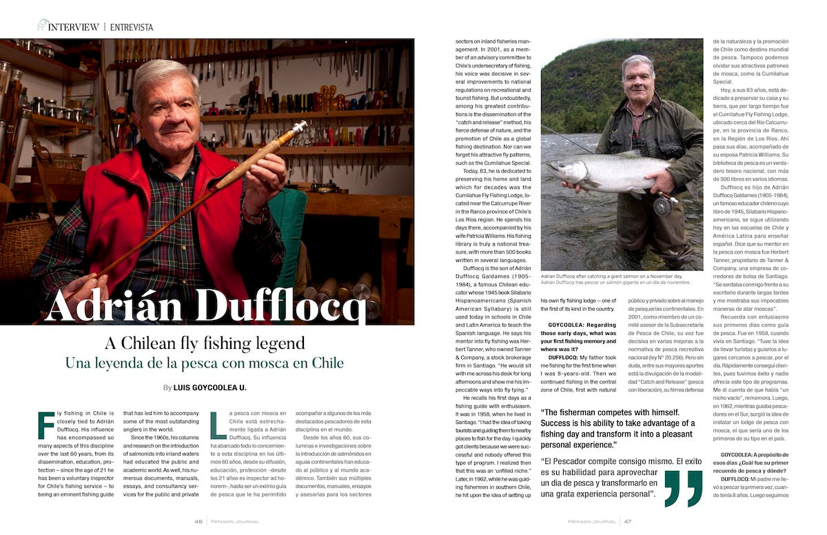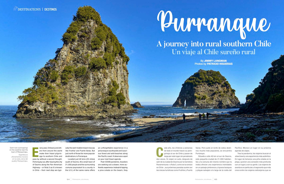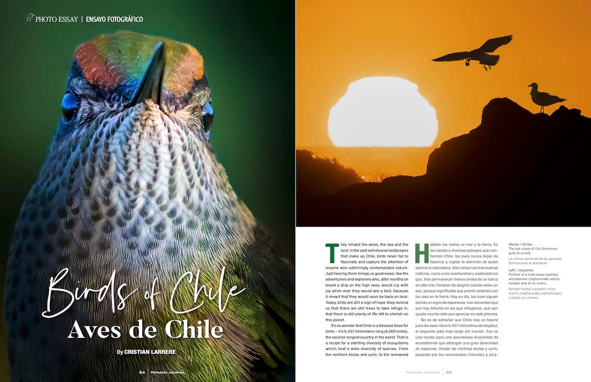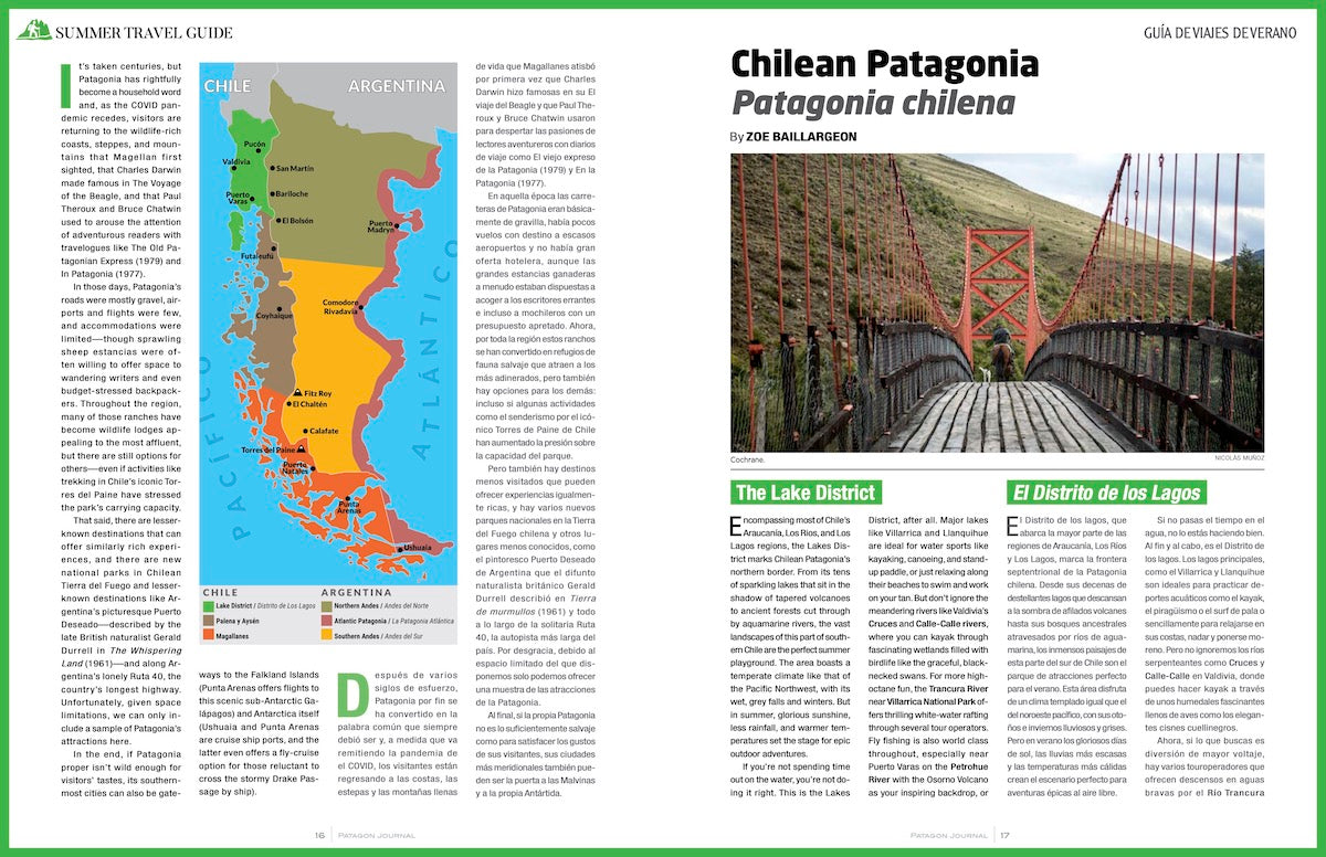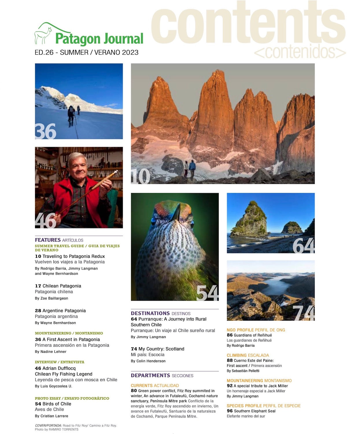 En esta edición, presentamos nuestra primera Guía de Viajes de Verano a la Patagonia, escrita por los reconocidos escritores de viajes Zoe Baillargeon y Wayne Bernhardson. También tenemos un extenso reportaje de Nadine Lehner sobre la primera expedición exclusivamente femenina al Campo de Hielo Norte; una entrevista con el leyenda chileno de la pesca con mosca, Adrian Dufflocq; un espectacular ensayo fotográfico sobre las aves de Chile, del fotógrafo Cristian Larrere; una mirada en profundidad a los viajes rurales y a la prístina costa de Purranque; y mucho, mucho más.