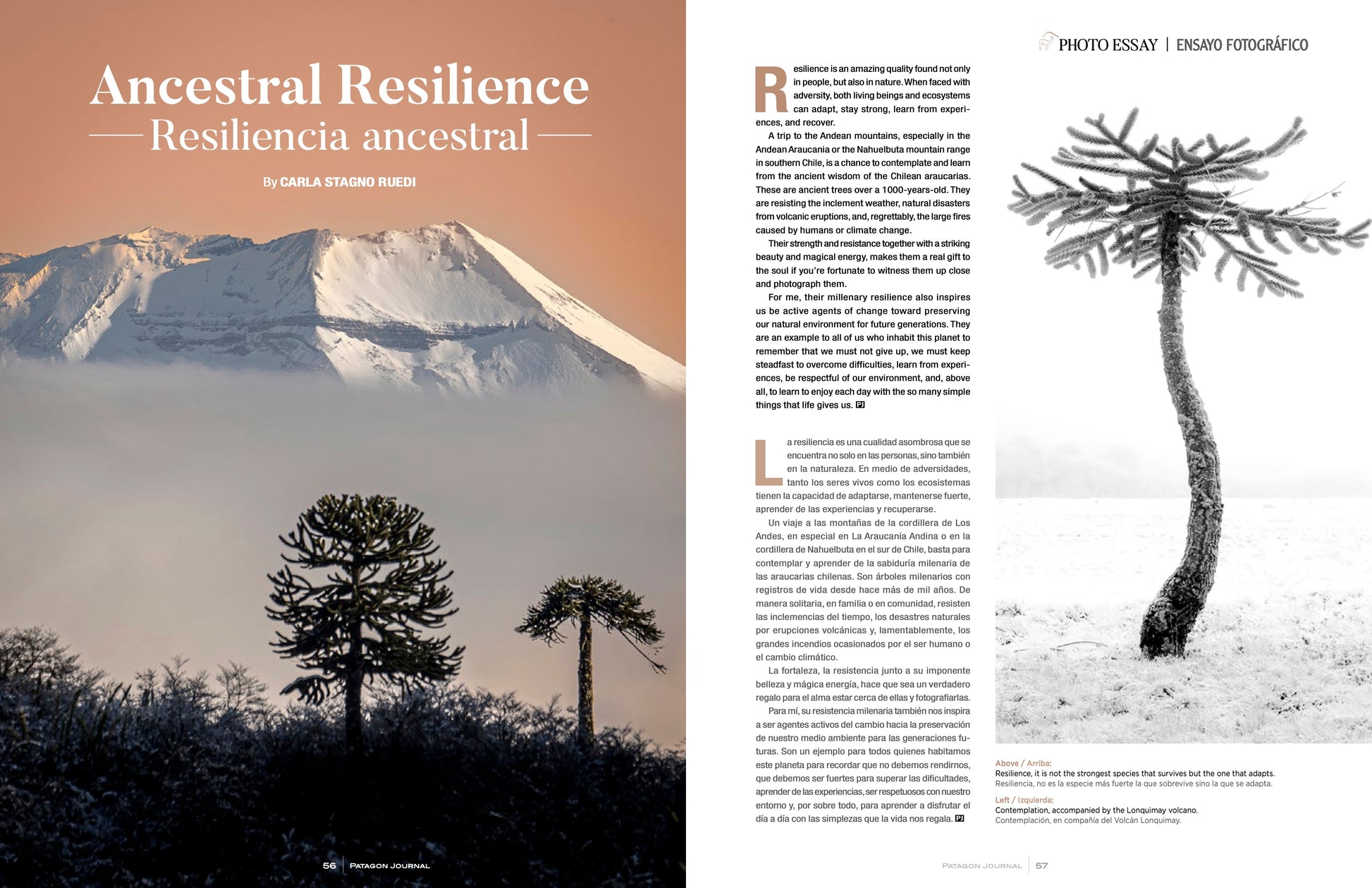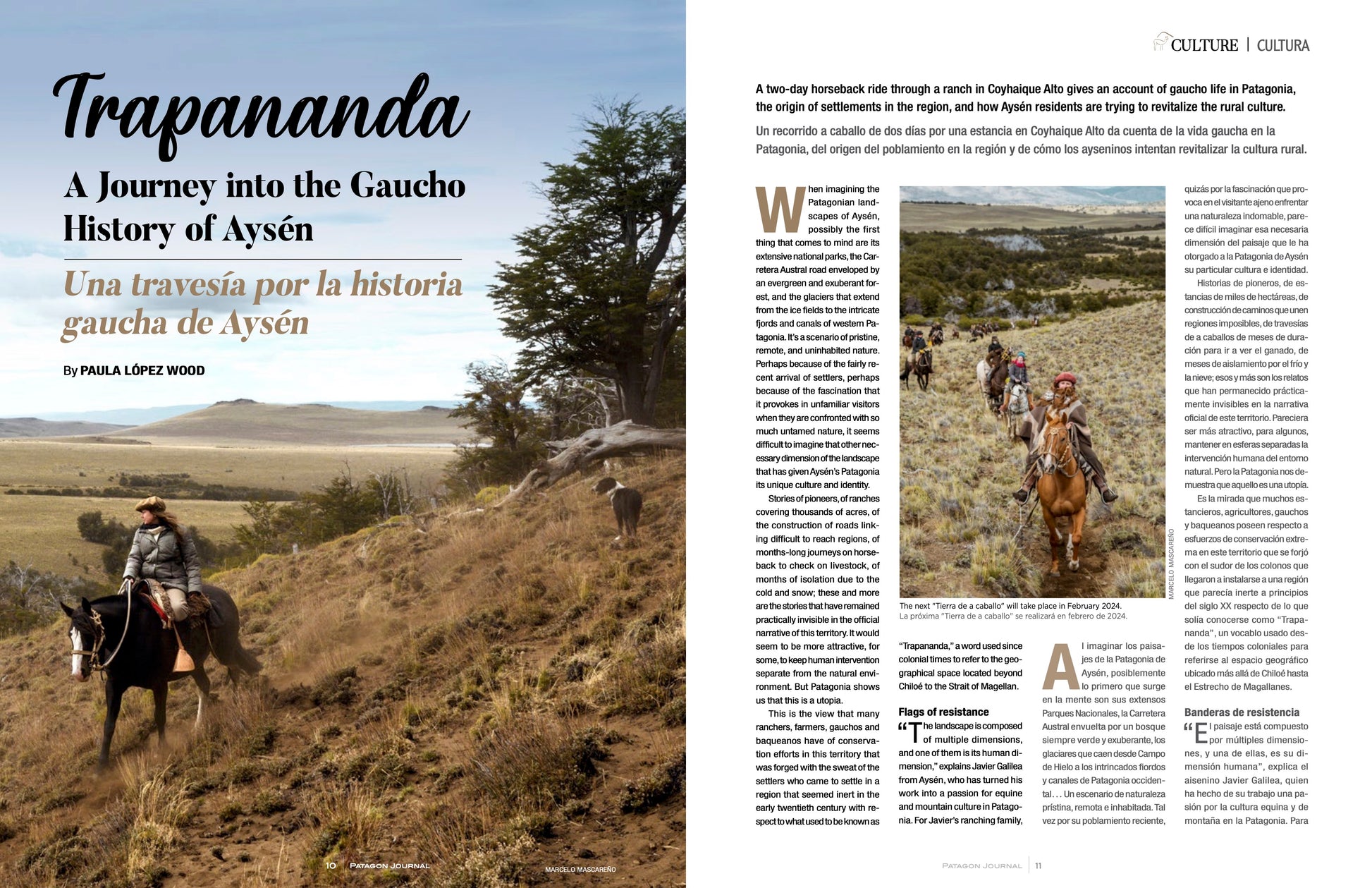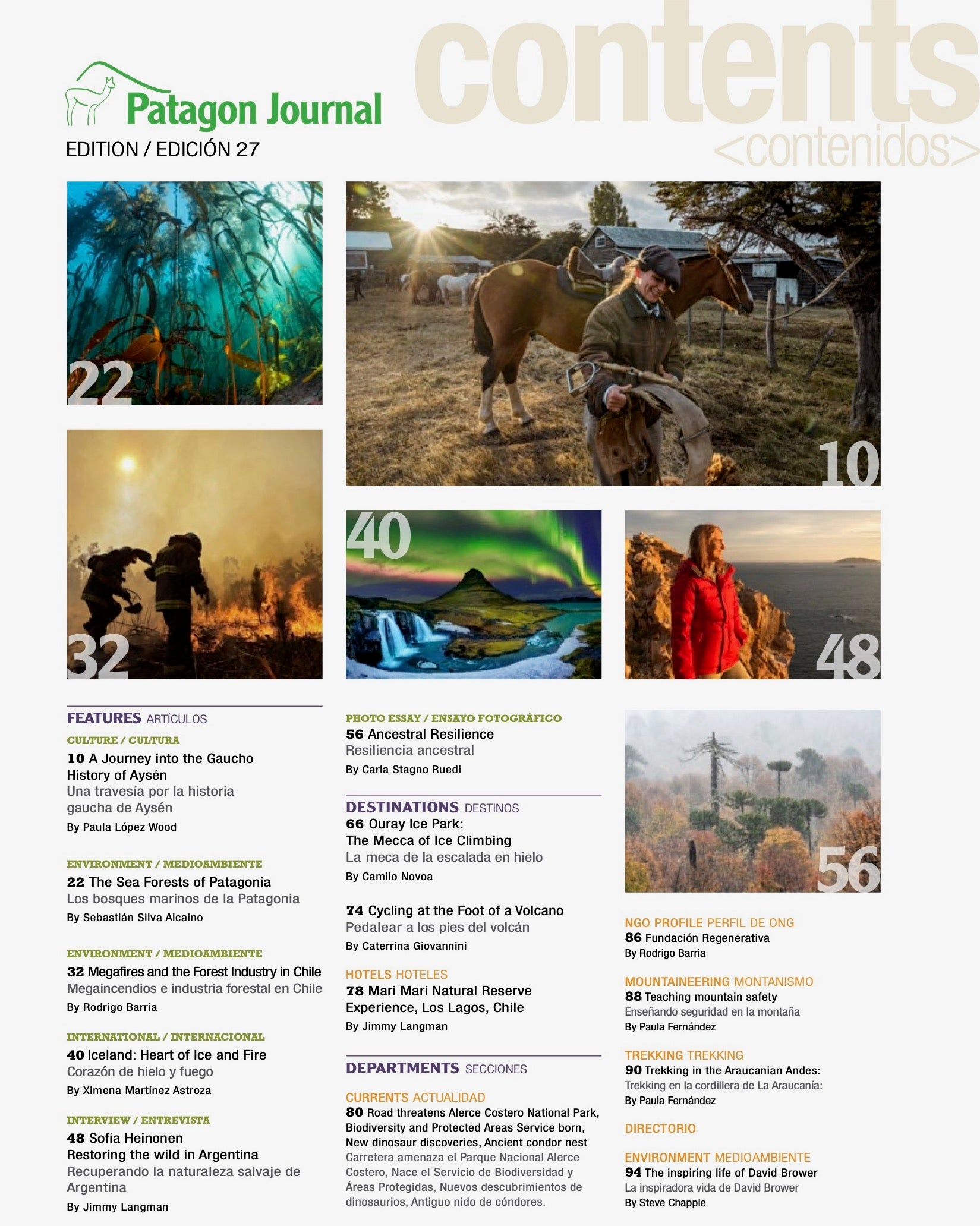En nuestro artículo de portada, Paula López Wood escribe sobre la vida gaucha en la Patagonia y sobre cómo los habitantes de Aysén intentan revitalizar su cultura rural. También en el número 27, tenemos un reportaje de Sebastián Silva Alcaíno sobre los bosques de mar del fin del mundo; Rodrigo Barría escribe sobre los megaincendios y cómo las plantaciones forestales en Chile se están combinando con el cambio climático para alimentarlos; Ximena Martínez Astroza escribe sobre su visita a las maravillas naturales de Islandia; Jimmy Langman entrevista a Sofia Heinonen sobre su trabajo en Rewilding Argentina; tenemos un ensayo fotográfico de Carla Stagno Ruedi sobre las araucarias milenarias; Camilo Novoa envía un despacho sobre el que, posiblemente, sea el mejor parque de escalada en hielo del mundo; y mucho más.