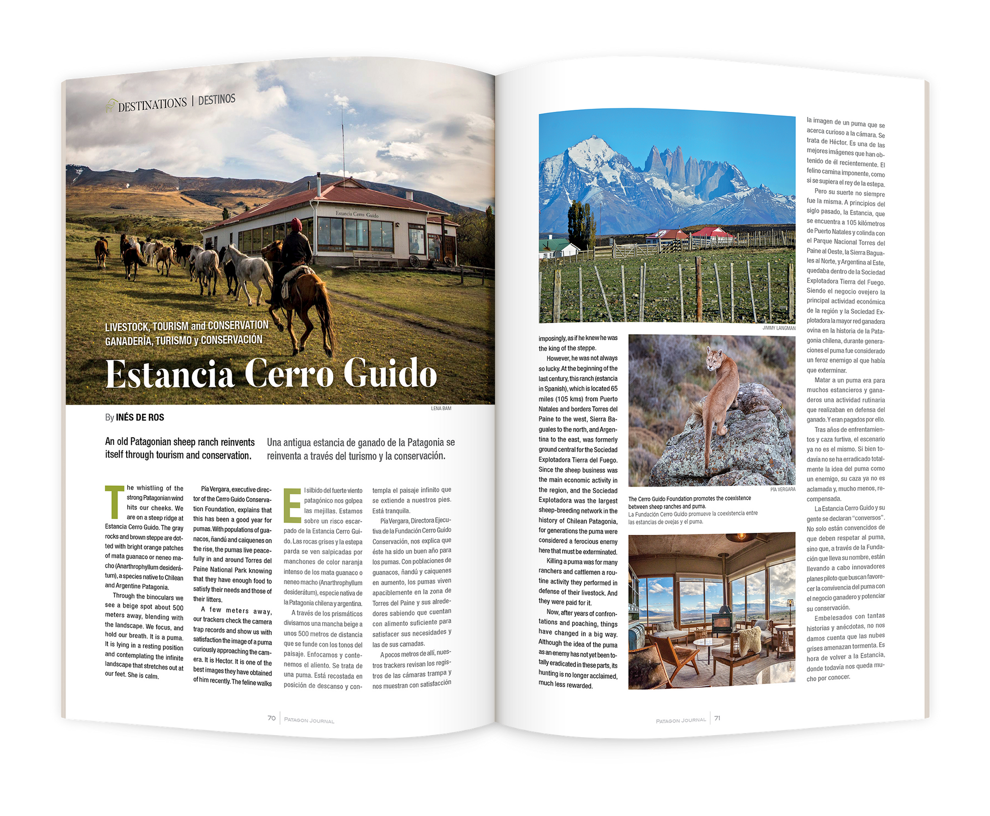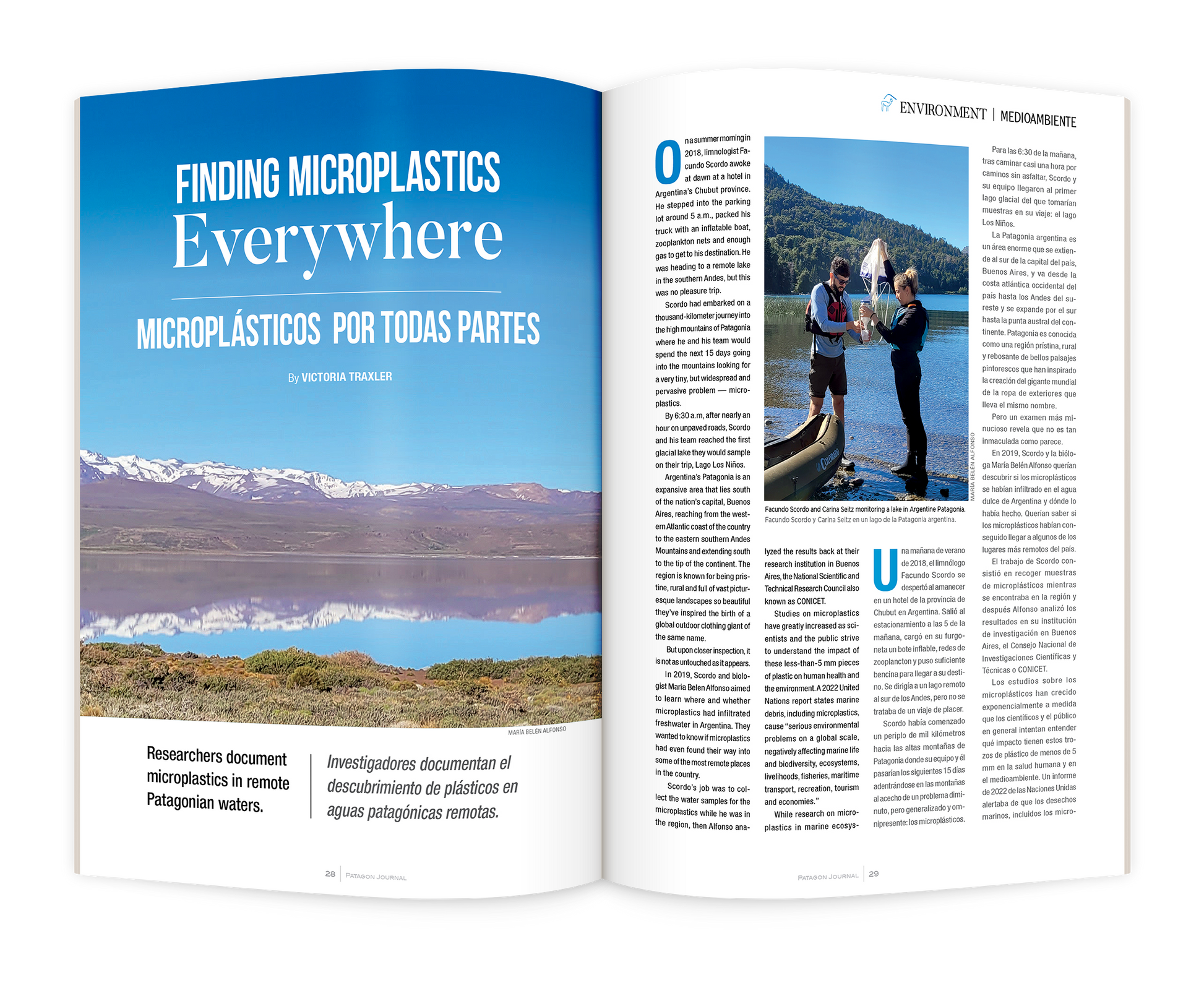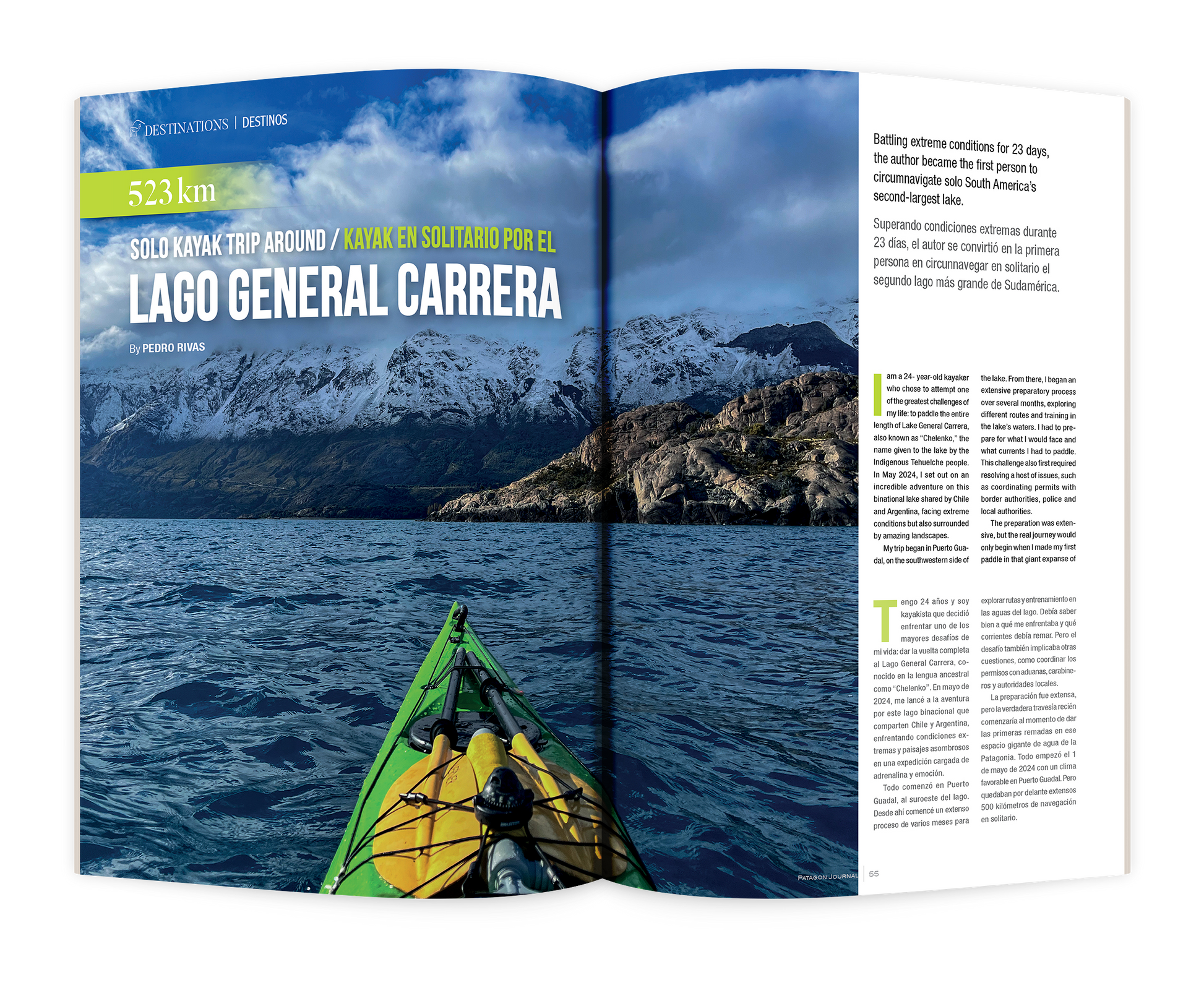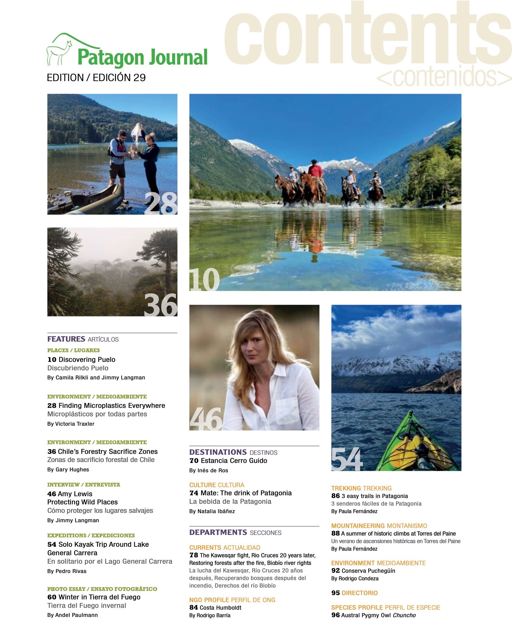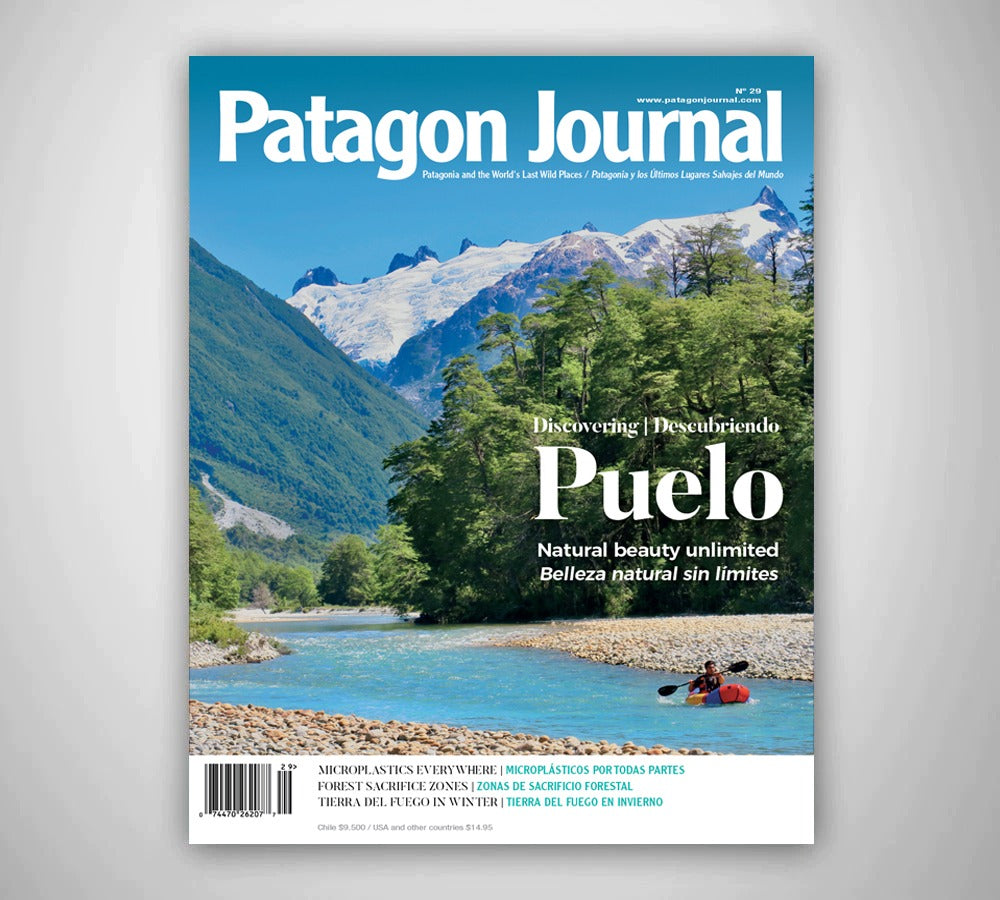 Nuestro reportaje de portada nos lleva a la comuna de Cochamó, en la región chilena de Los Lagos, que alberga el Valle del Puelo y una belleza natural sin límites. También en la Edición 29, Victoria Traxler escribe sobre el hallazgo de microplásticos en lagos patagónicos remotos; Gary Hughes nos lleva a la cordillera de Nahuelbuta para mostrarnos cómo es la destrucción medioambiental y social causada por las plantaciones forestales; Pedro Rivas escribe sobre su histórica expedición en solitario en kayak alrededor del lago General Carrera; Patagon Journal entrevista a Amy Lewis, de la Fundación WILD; Andel Paulmann contribuye con un ensayo fotográfico de Tierra del Fuego en invierno; y Inés de Ros escribe sobre cómo la Estancia Cerro Guido se está reinventando a sí mismo a la vez que protege al puma en la Patagonia; y mucho más.