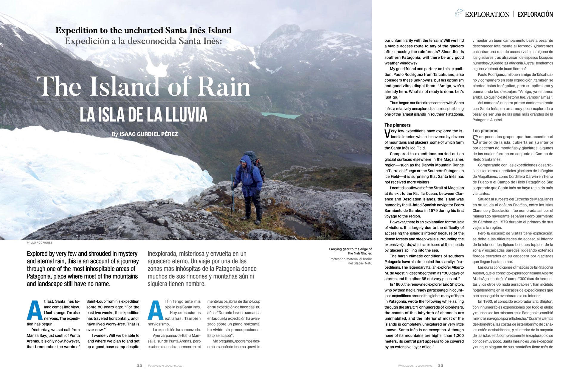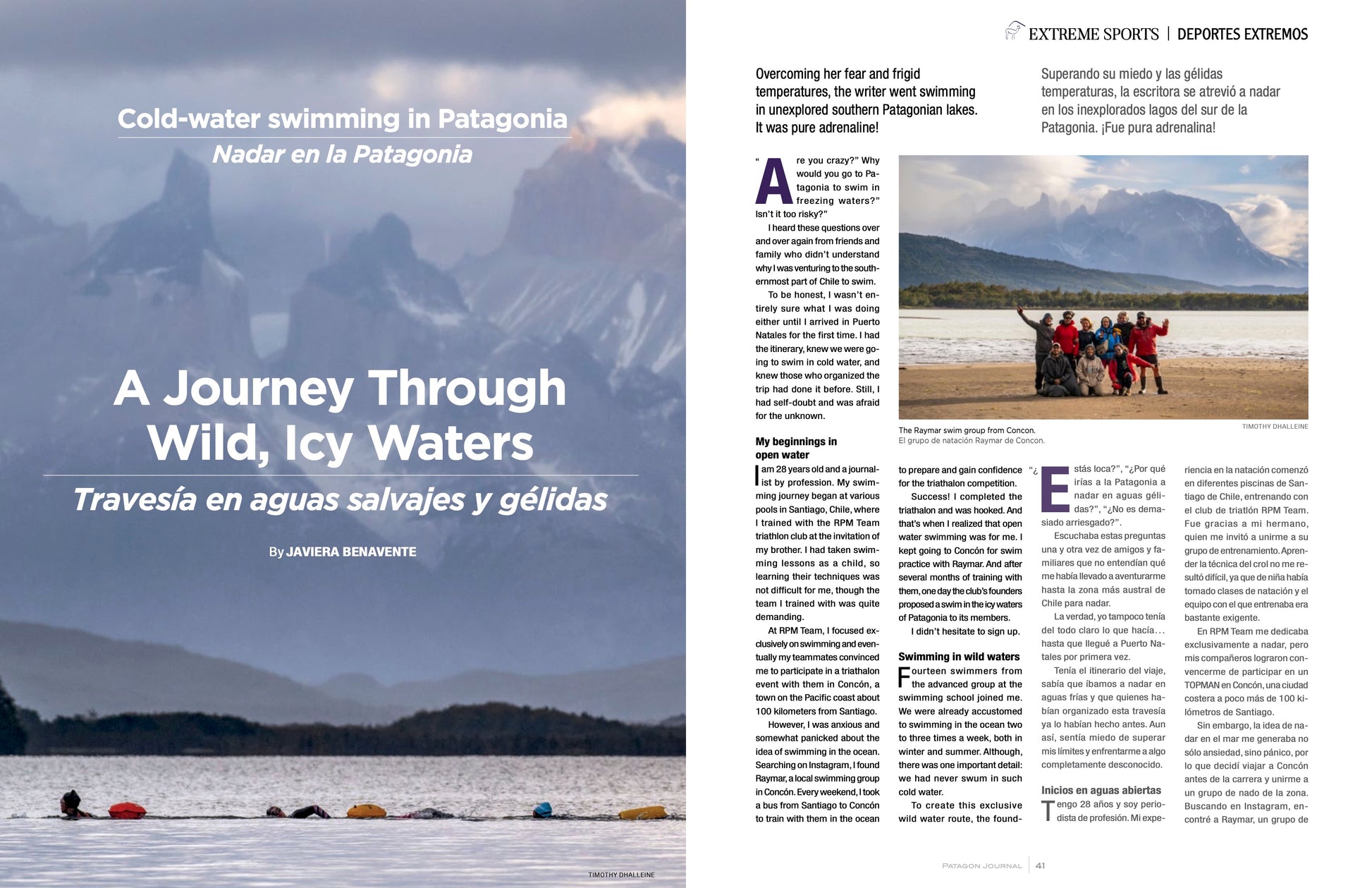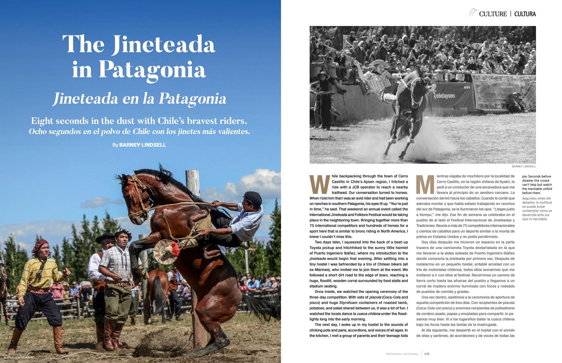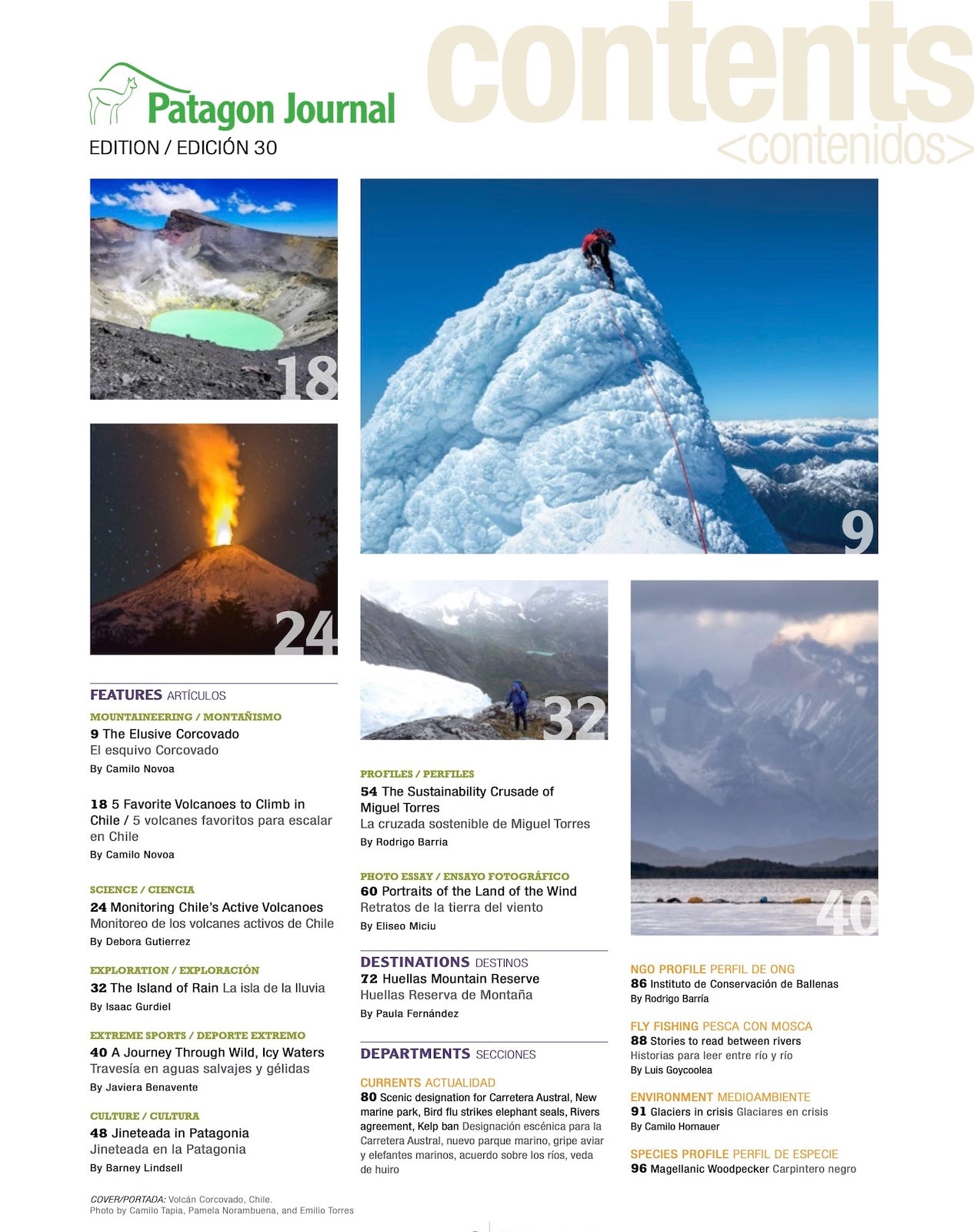También en la edición 30, el fotógrafo Eliseo Miciu presenta un impresionante ensayo fotográfico de 14 páginas que busca y consigue revelar el alma de la Patagonia; Javiera Benavente escribe sobre la natación en las gélidas aguas de la naturaleza salvaje del sur de la Patagonia; Rodrigo Barría perfila al viticultor español Miguel Torres y sus admirables esfuerzos por llevar la sostenibilidad medioambiental a la industria mundial del vino; Isaac Gurdiel nos habla de la exploración de la poco visitada isla de Santa Inés; y Barney Lindsell examina las jineteadas, los rodeos gauchos de la Patagonia.
